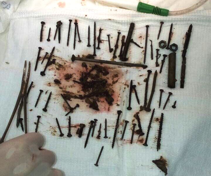 Сделав разрез, врачи добрались до желудка и были шокированы, увидев там длинные гвозди, крупные шурупы, болты, гайки, дверные шпингалеты, отрезки арматуры длиной до 15 см и даже серебряную цепочку 925 пробы. В итоге из желудка пенсионерки было извлечено 152 железных предмета, которые уже начали окисляться. Сколько они там находились, так и осталось никому не известным, кроме самой женщины.