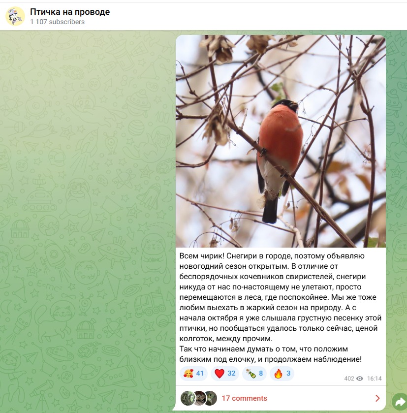 «В отличие от беспорядочных кочевников-свиристелей, снегири никуда от нас по-настоящему не улетают, просто перемещаются в леса, где поспокойнее. Мы же тоже любим выехать в жаркий сезон на природу», — говорится в публикации.