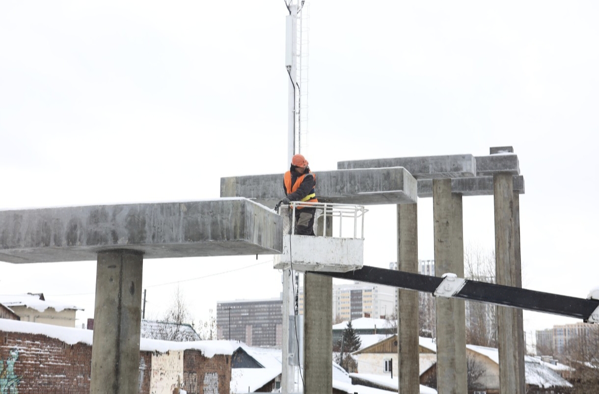 Продолжается строительство пешеходного моста через железную дорогу в районе улицы Войкова. На стройплощадке монтируют пролётное строение длиной 39,5 метра – оно станет главным элементом будущего перехода. Мэр Максим Кудрявцев проконтролировал ход работ.