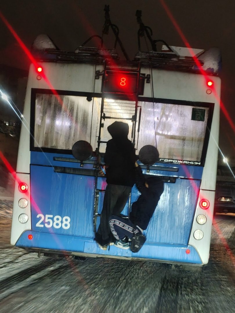 По словам авторов сообщения, они двигались на автомобиле по улице Выборной в сторону КПП и заметили на лестнице сзади троллейбуса нескольких детей. Остановить общественный транспорт на ходу не было возможности.