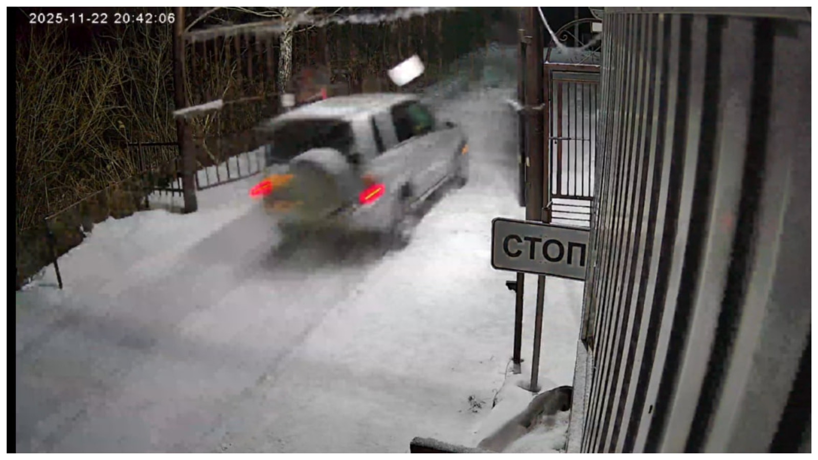 «АСТ-54» поделились видео, где серый кроссовер Suzuki на большой скорости просто снёс ворота, стремясь покинуть территорию СНТ.