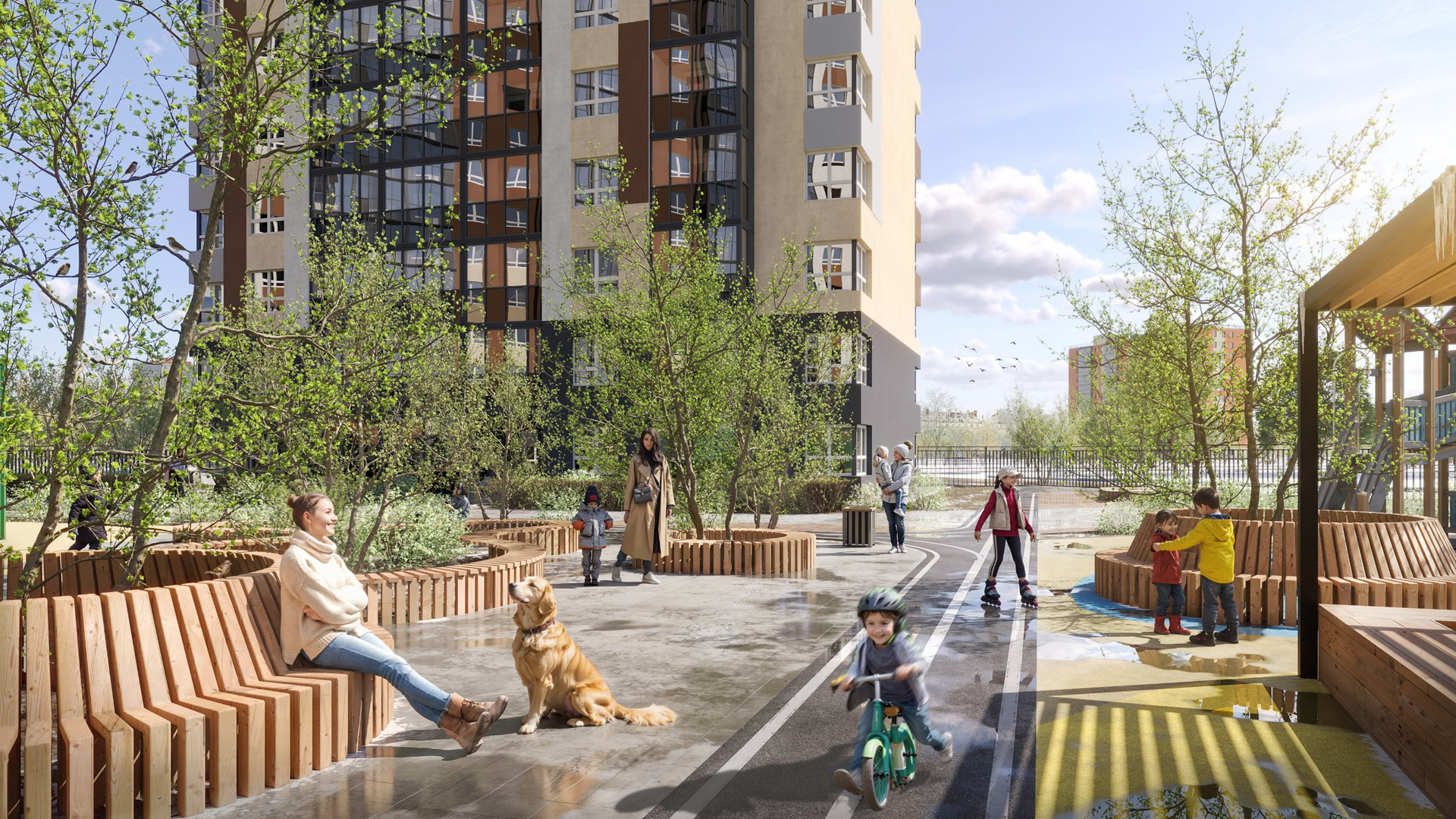 Концепция проекта «город в городе» предполагает создание автономной среды с благоустроенными дворами-парками, спортивными и детскими площадками. Поблизости расположены 4 школы, 3 детских сада и объекты розничной торговли.