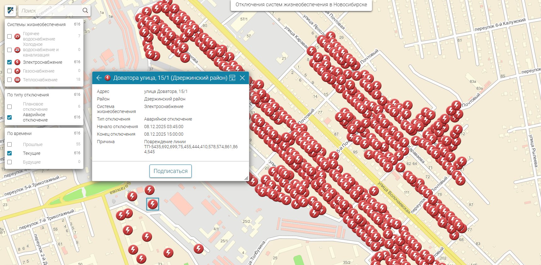 Крупная авария на электросети 8 декабря оставила без света 616 жилых домов в Дзержинском районе. Об этом свидетельствуют данные на муниципальном портале.