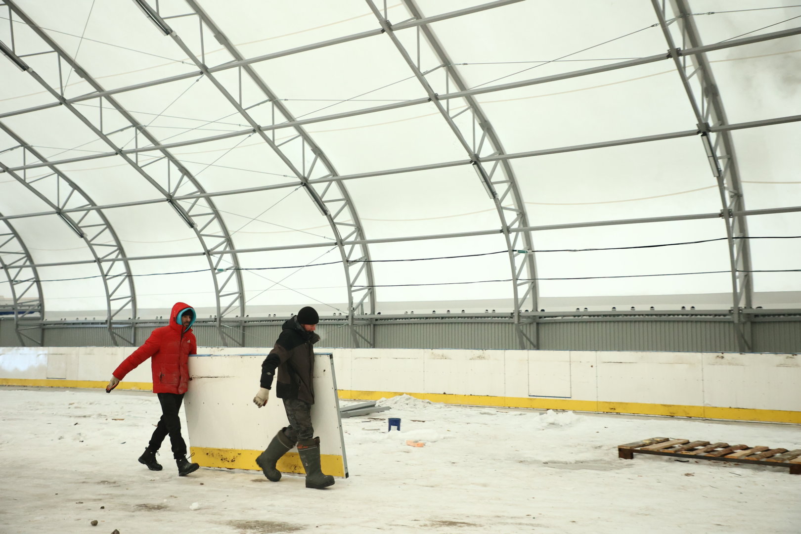 На сегодня завершены работы по возведению каркасно-тентовой конструкции, которая будет служить крышей хоккейной площадки. Монтируется каркас модульных раздевалок и тренировочного зала, устанавливаются борта будущего катка. Эти работы завершат до конца декабря. Весной начнутся работы по подключению инженерных коммуникаций. Сдать объект планируют в июне.