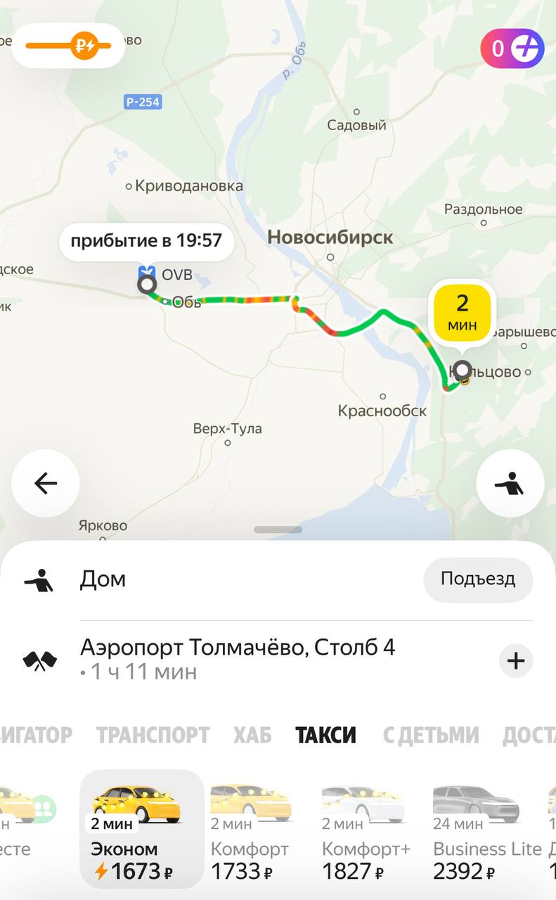 Ещё один пример — поездка из Первомайского района в аэропорт Толмачёво. За тариф «эконом» приложение предложило цену около 1700 рублей, что пассажиры сравнили с половиной стоимости авиабилета в Москву.