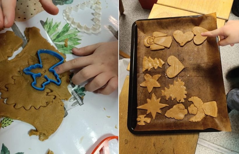 Следующий шаг превратил кухню в настоящую творческую мастерскую. Перед каждым ребёнком лежал набор формочек. Кто-то с уверенностью выбирал классическую ёлку или рождественскую звезду, кто-то — милого ангелочка или символичное сердечко. Дети с большим старанием раскатывали тесто и аккуратно выдавливали выбранные формы.
