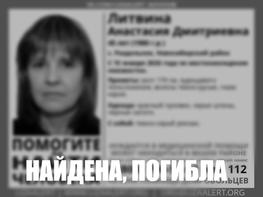 20 января «ЛизаАлерт» сообщили, что женщину нашли, но, к сожалению, мёртвой.