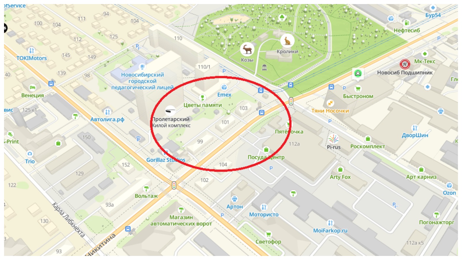 Сейчас там расположены три жилых барака: Никитина 99, 101 и 103, а также задний двор. За участком уже стоит 25-этажный жилой комплекс.