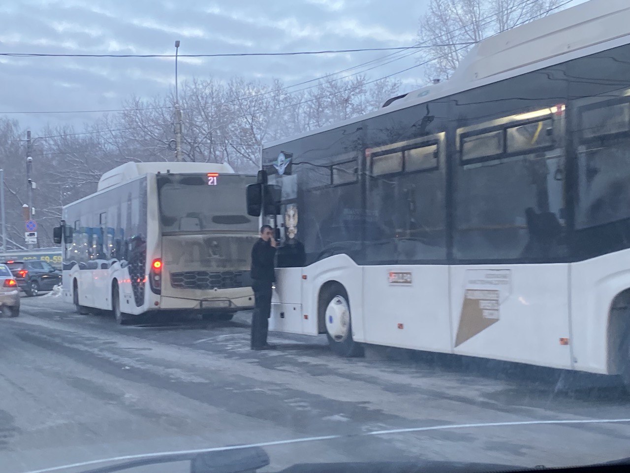 Она также попросила знакомого автомобилиста, который в этот момент ехал в том же направлении, сделать фотографии стоящих на аварийных сигналах автобусов.