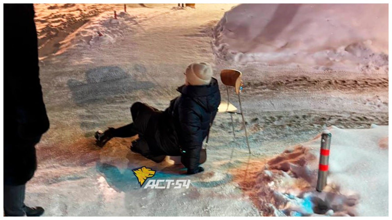 Телеграм-канал «АСТ-54 Black» поделился историей из Октябрьского района: там, около дома №20 по улице Садовой, местная жительница поскользнулась на скованной льдом дороге — прямо на пешеходном переходе — и упала.