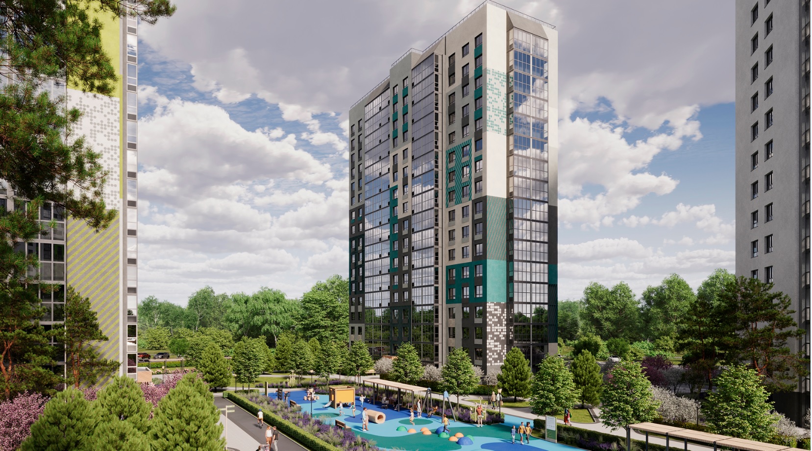Экоквартал «На Кедровой» — пример обустройства локации добрососедства и яркого детства. Жителям доступно около 7 га дворов с лаунж-пространствами, беговыми дорожками, спортивные ворк-аут комплексами. Точкой притяжения экоквартала стала центральная площадь с сухим фонтаном, где разместятся кафе с летними верандами, аллеи для прогулок.