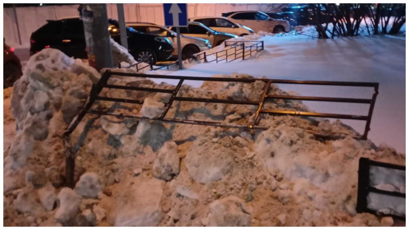 Другой подарок от администрации ждал на Улице Обской — она параллельная Большевистской. Там снег, конечно, почистили, но вместе со снегом в сугроб сгребли и металлические ограждения.