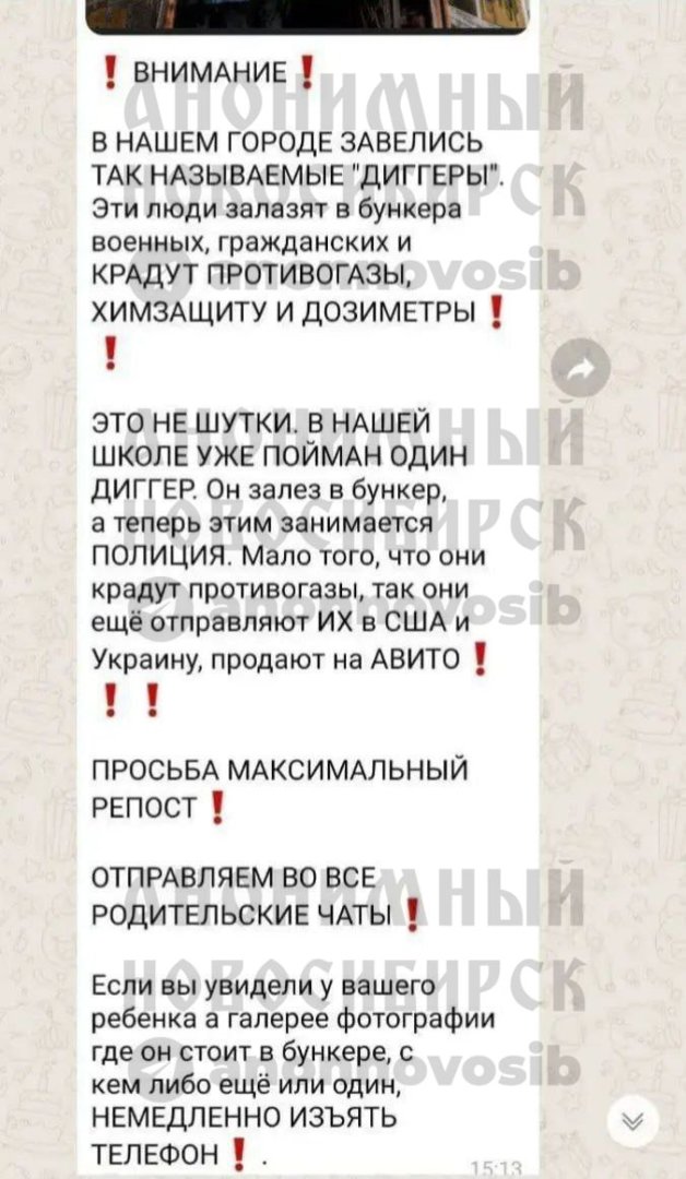 Учительница утверждала, что в городе завелись некие «диггеры», которые проникают в гражданские и военные бункеры и крадут противогазы, средства химзащиты и дозиметры. По её словам, украденное затем якобы отправляют «в США и Украину» или продают на онлайн-площадках.