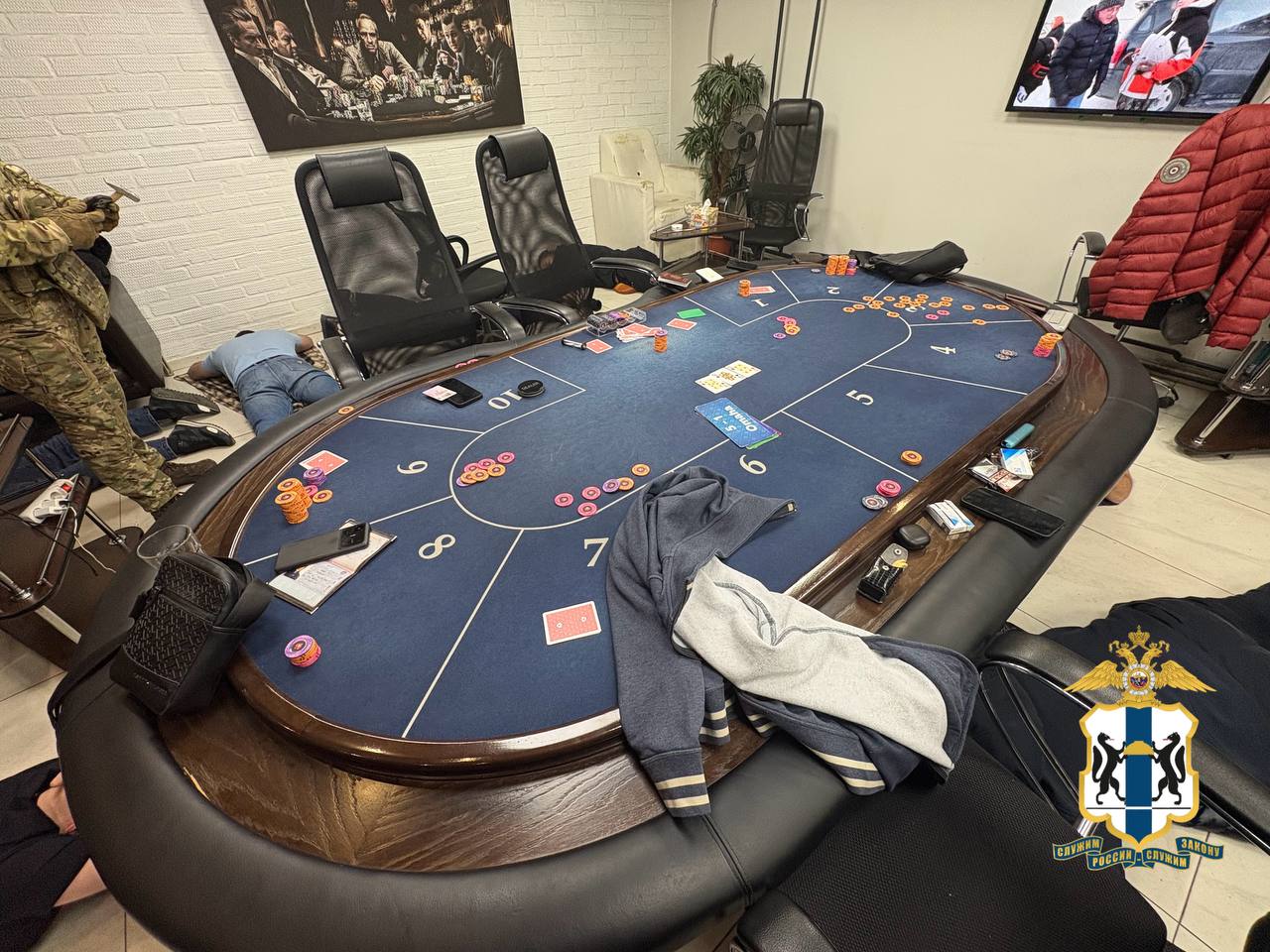 Силовики проникли в помещение, где в момент рейда находились не только организаторы и персонал, но и 13 игроков. В зале работали крупье и бармен, посетители соблюдали строгие меры конспирации.