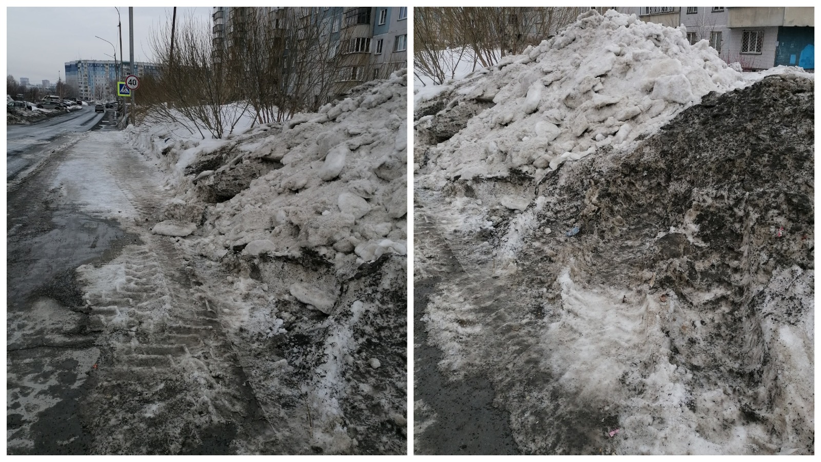 На Высоцкого ситуация не лучше: снег свалили прямо на озеленённую территорию у дома, переломав высаженные кустарники.