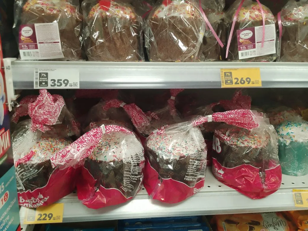 Самый бюджетный вариант, который попался в объектив нашего корреспондента, — маленький кулич за 49 рублей. Совсем крошечный, на один раз. Чуть крупнее продают за 89, 119 рублей.