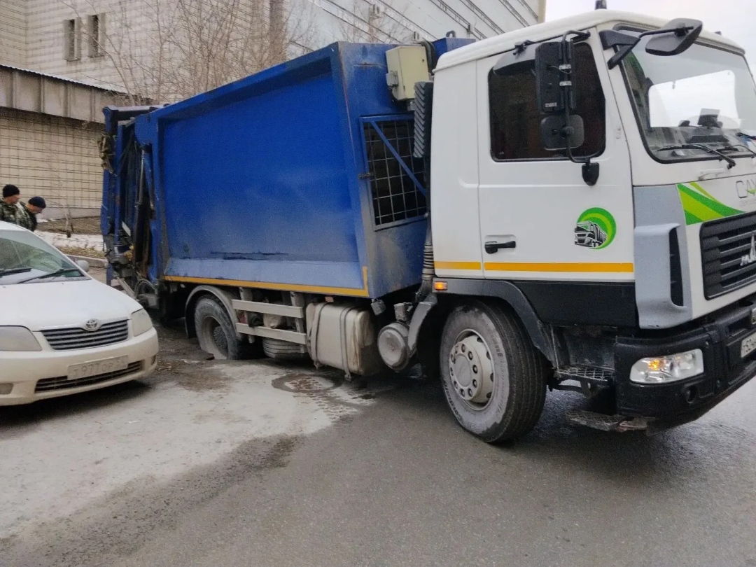 В Новосибирске мусоровоз провалился прямо в асфальт. Инцидент произошел утром 7 апреля на улице Октябрьской при заезде спецтехники во двор дома № 17.