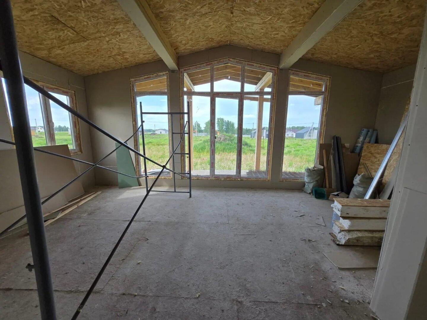 За всё время рабочие залили фундамент, поставили стены (дом каркасный) и настелили крышу. Стоявшая под дождями и снегом конструкция в итоге деформировалась – стеновые панели набухли от влаги.