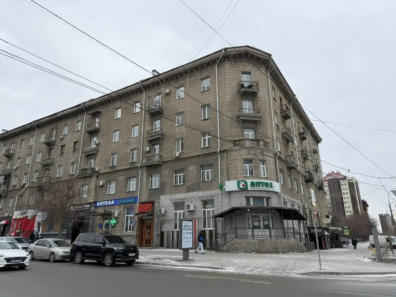 Главный архитектор города и замначальника департамента строительства и архитектуры мэрии Иван Штурбабин пояснил, что изначально здание строилось как двухэтажный коммерческий объект для нужд аптечного синдиката. В 1950-х его надстроили жилыми этажами, облицевали гранитом и включили в ансамбль кинотеатра «Победа».