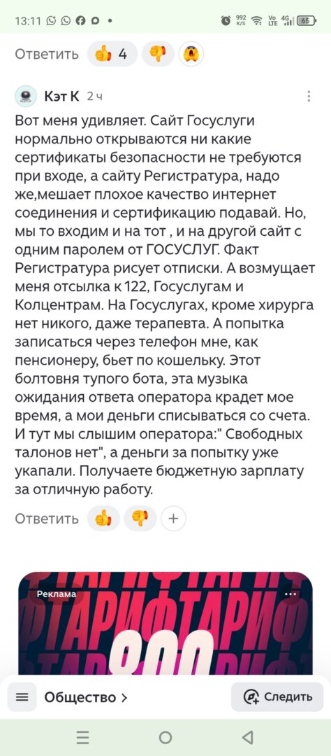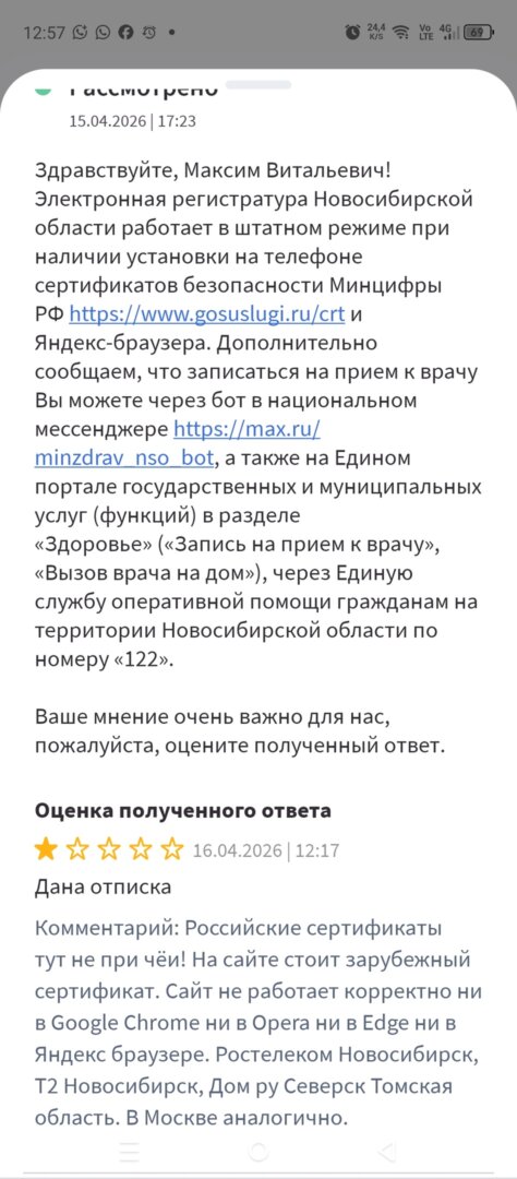 «Новосибирск, крик души, помогите придать огласке проблему. Уже больше недели без средств обходов блокировки не работает сайт электронной регистратуры reg.nso.ru. Зайти невозможно ни с домашнего интернета, ни с мобильного, установка российских сертификатов Минцифры, которые посоветовали установить в ответ на моё письмо в региональный Минздрав, тоже не помогает. А ведь этот сайт — не развлечение, а важный сервис: запись к врачу, анализы, расписание. Сейчас без обходных средств им пользоваться невозможно. Есть ощущение, что сайт или его IP попал под какие-то блокировки/фильтрацию, потому что через обходные средства всё работает корректно. Мы уже не знаем, куда ещё писать. Очень просим обратить внимание на проблему и помочь донести её до ответственных служб», — написал Максим.