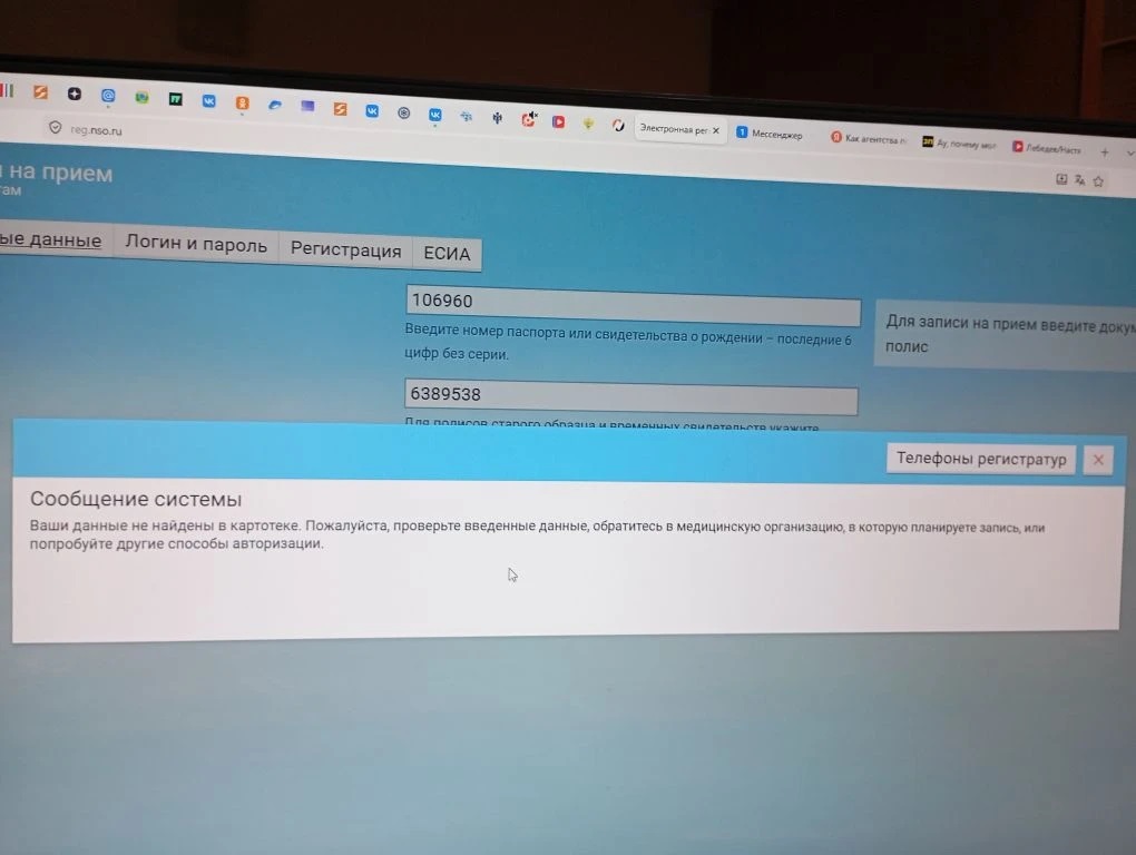 Журналист НДН.Инфо лично попробовал записаться на приём и столкнулся с другой проблемой. Сайт с рабочего компьютера открылся без проблем, но после введения номера паспорта и медицинского полиса ему сообщили, что данные отсутствуют в картотеке. Хотя он много лет стоит на учёте в своей поликлинике, и недавно пользовался её услугами, но в оффлайн-режиме. Записаться через сайт и телефон тоже не удалось.