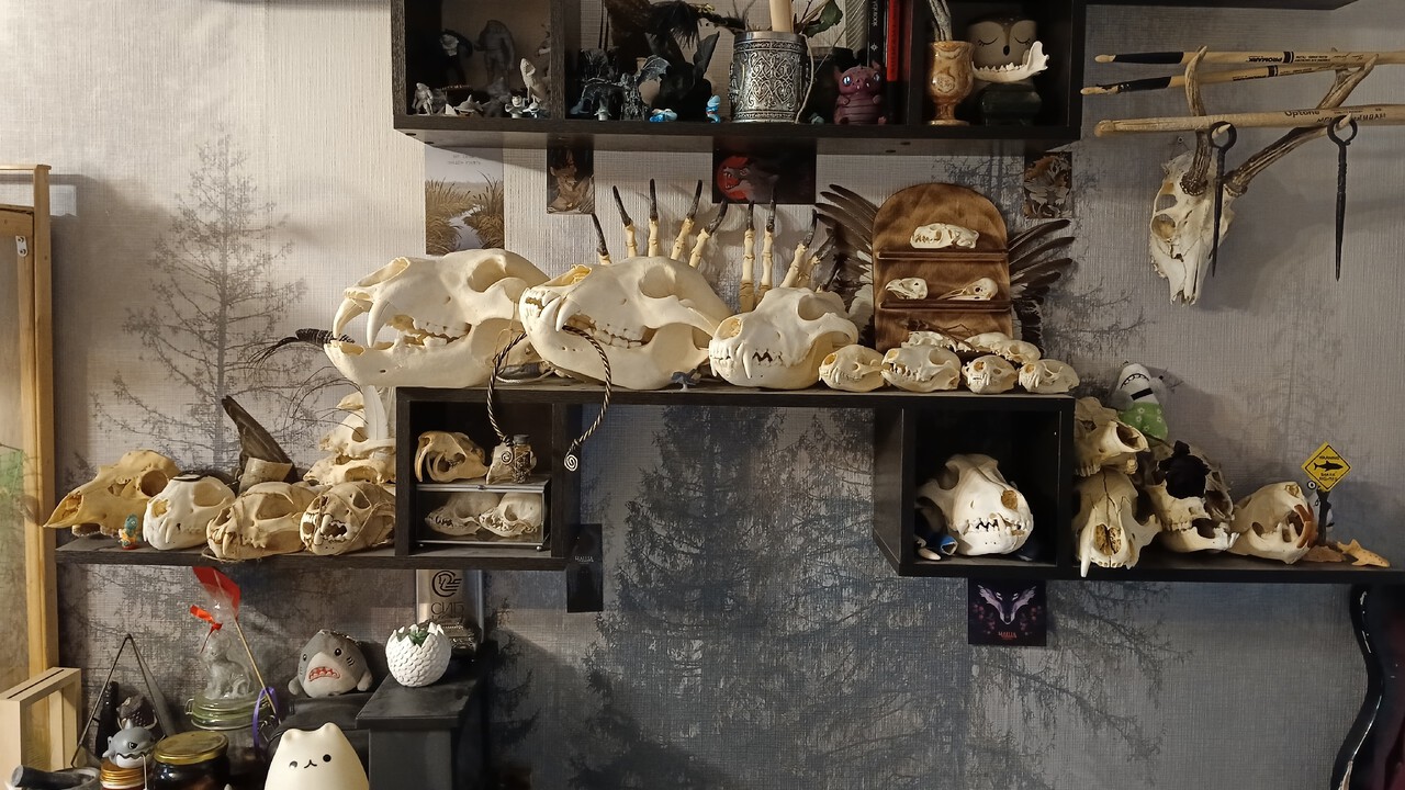Коллекция черепов и плюшевые акулы