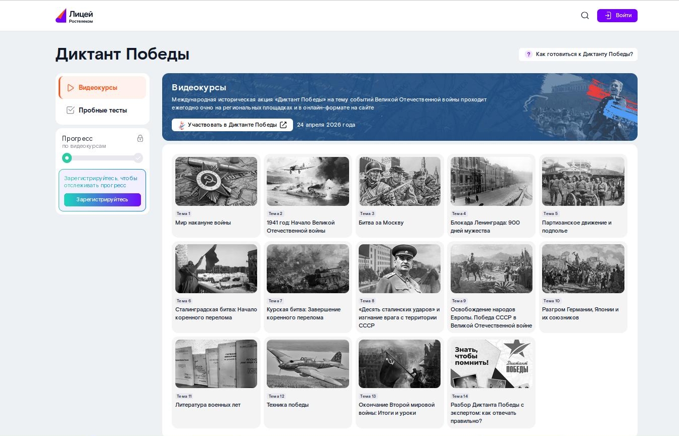 «Для подготовки к Диктанту Победы в марте прошлого года мы запустили одноименный раздел на нашей образовательной платформе «Ростелеком Лицей», который доступен бесплатно и без регистрации. Здесь собраны пробные тесты, тематические конспекты и видеолекции Российского военно-исторического общества. Подготовку к Диктанту на «Лицее» прошли уже свыше 200 тысяч человек».