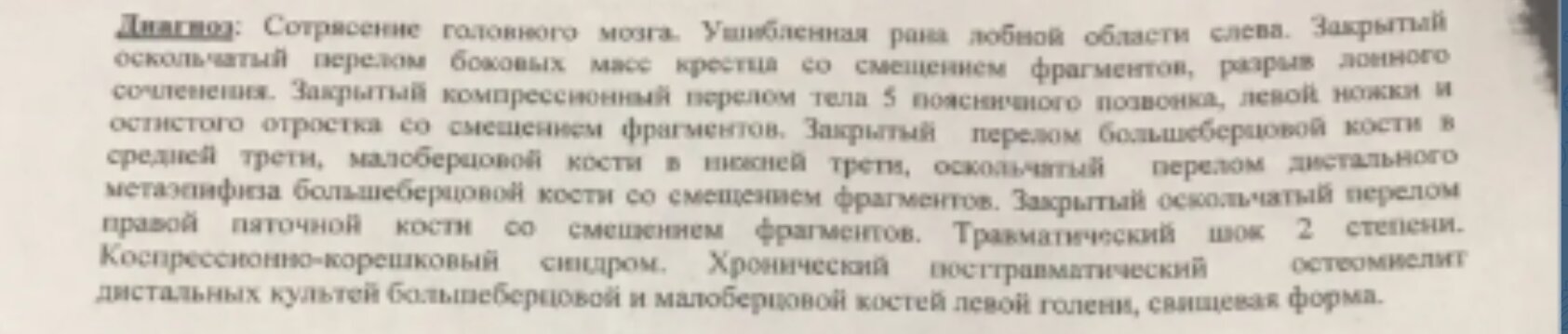 Его диагноз – длинный список переломов, сотрясение головного мозга, разрывы и так далее.