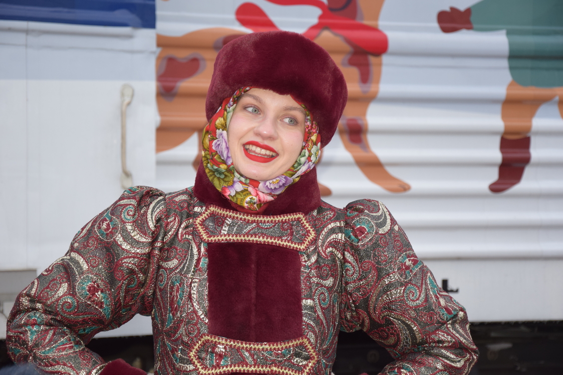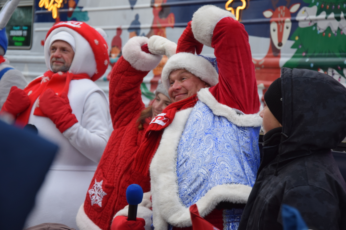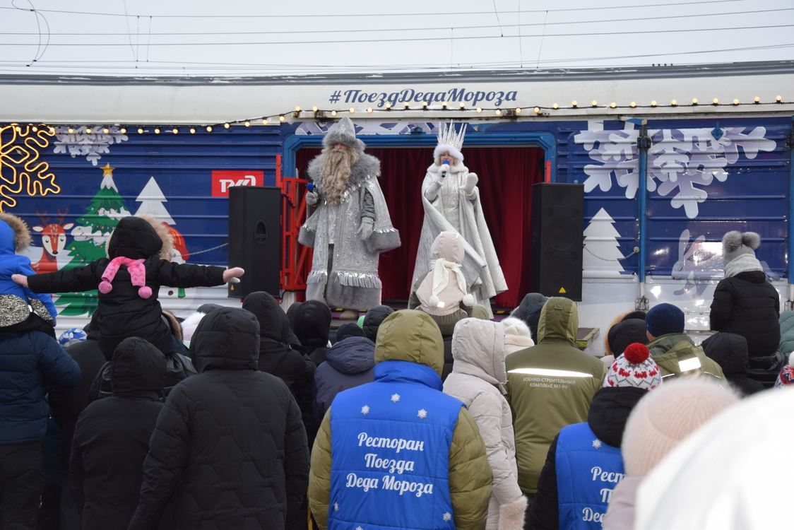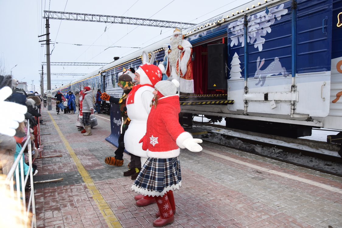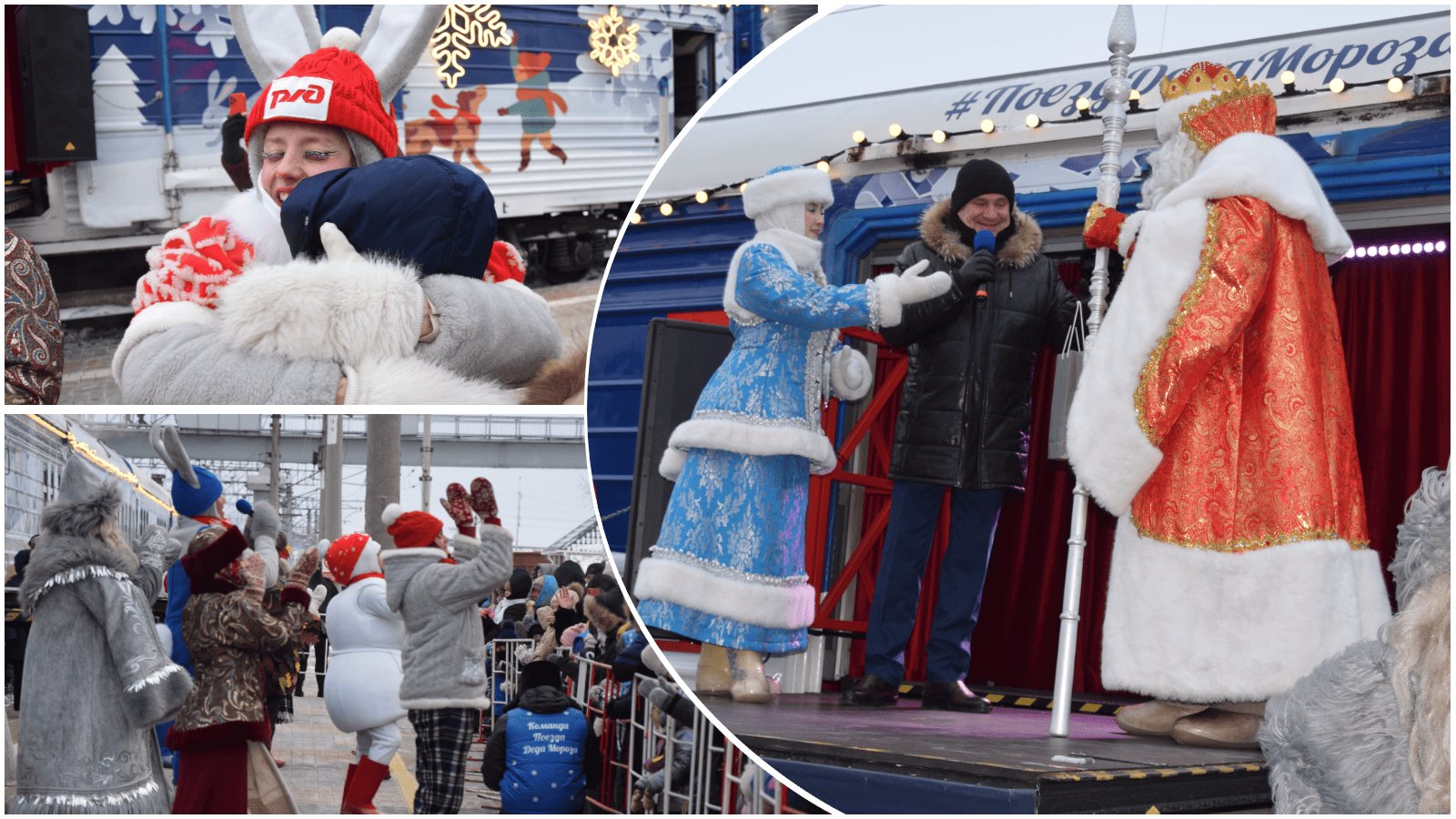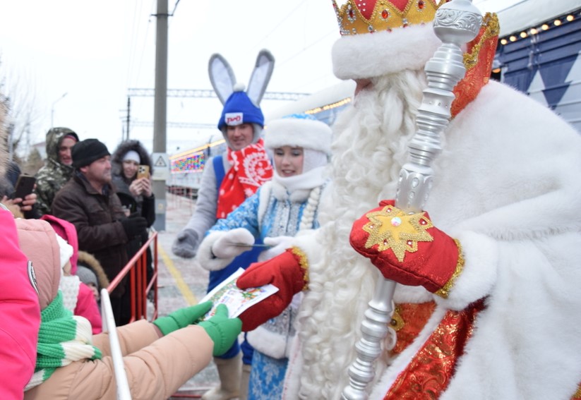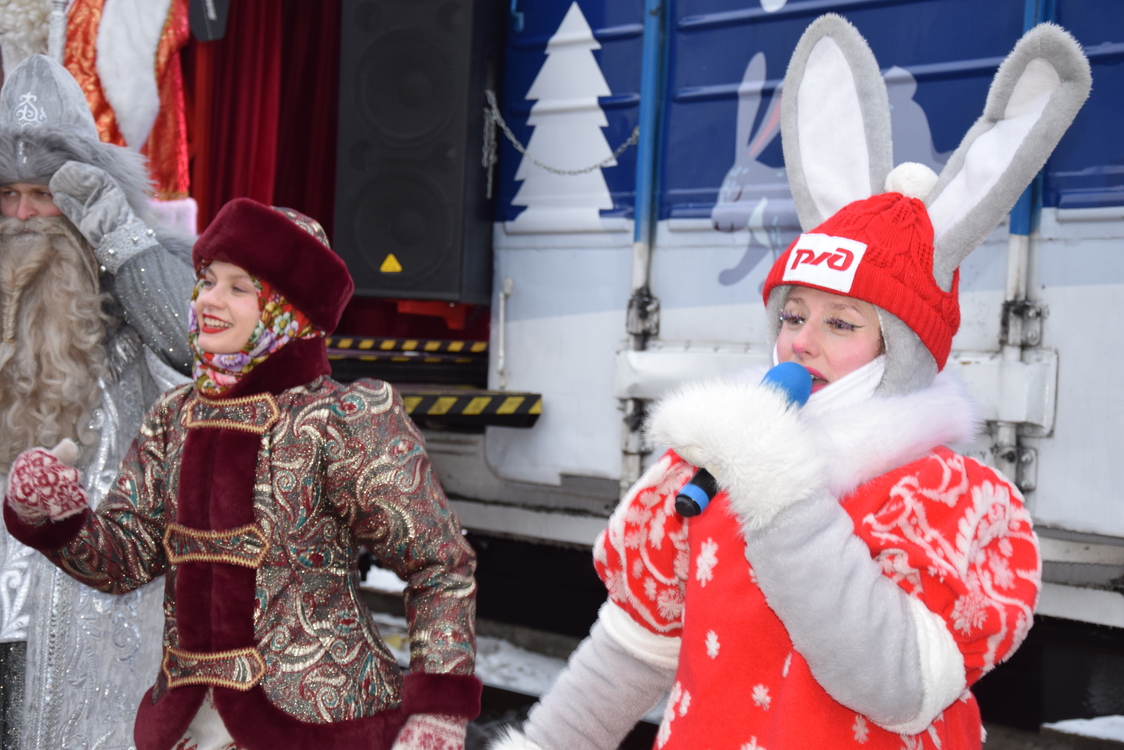 На перроне приграничного города развернулось настоящее праздничное представление. Публику развлекали Снеговичок, Гном, Зайчики, Мороз-Трескун и главные герои — Дед Мороз и его внучка Снегурочка. Все вместе пели и танцевали.