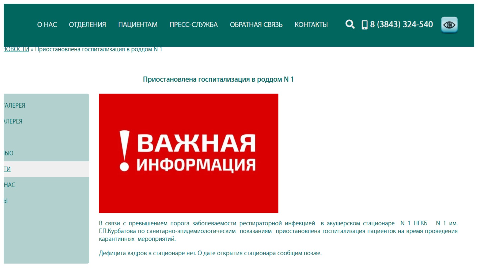 13 января на официальном сайте больницы появилось сообщение о временном прекращении приёма новых пациенток. В сообщении указывалась причина: эпидемия респираторных заболеваний в акушерском стационаре.