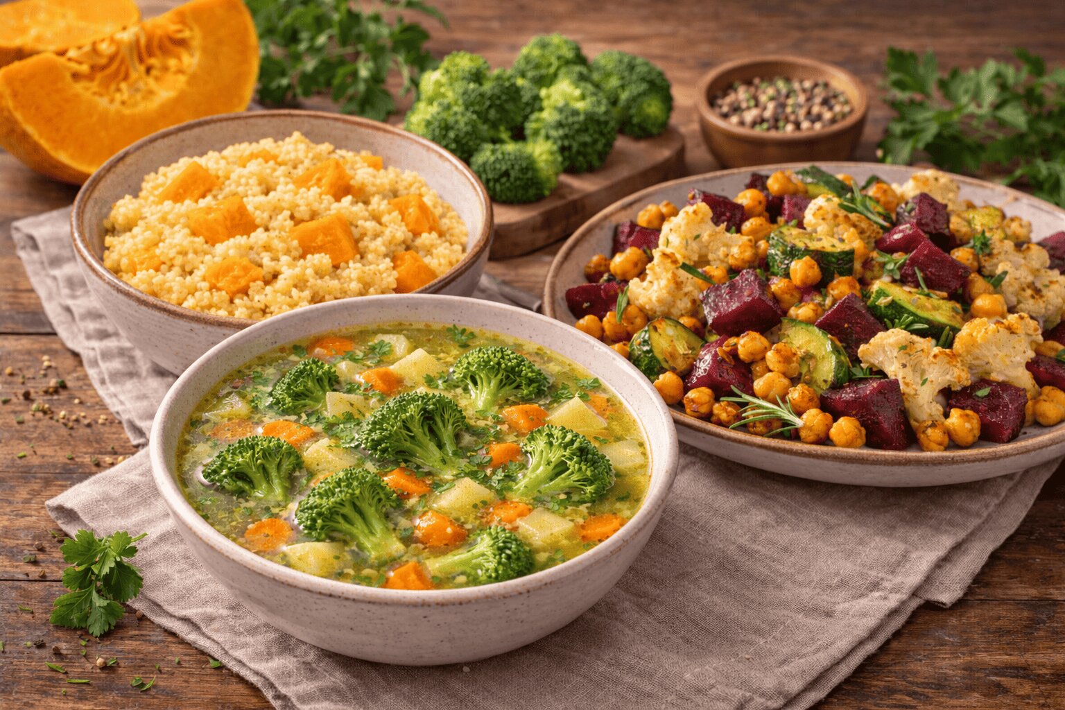 Наливаем в кастрюлю примерно 1,5 литра воды, по вкусу кладём соль и доводим до кипения. Пока вода греется, нарезаем овощи на кусочки, при желании лук и морковку можно пассеровать, но так как масло использовать нельзя, вместо него наливаем в сковороду немного воды. Далее бросаем овощи в кастрюлю и варим 10-15 минут, лучше на всякий случай проверить овощи на мягкость, поймав брокколи ложкой и раздавив о стенку кастрюли. Этот суп можно легко превратить в суп-пюре с помощью блендера, если вы любитель такого варианта — обязательно попробуйте.